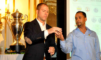 El director de la Academia Cosmos, Giovanni Savarese, izquierda, el día del sorteo con Andrés Estrada, ex jugador de la selección Colombia.