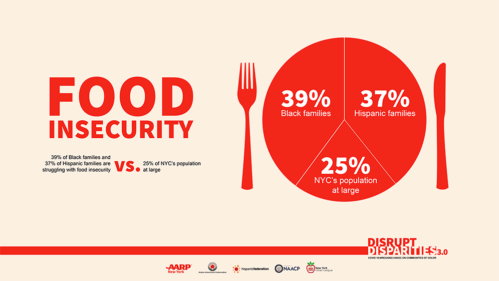 - El 39% de las familias negras y el 37% de las hispanas luchan contra la inseguridad alimentaria en comparación con el 25% de la población total de la ciudad de Nueva York.