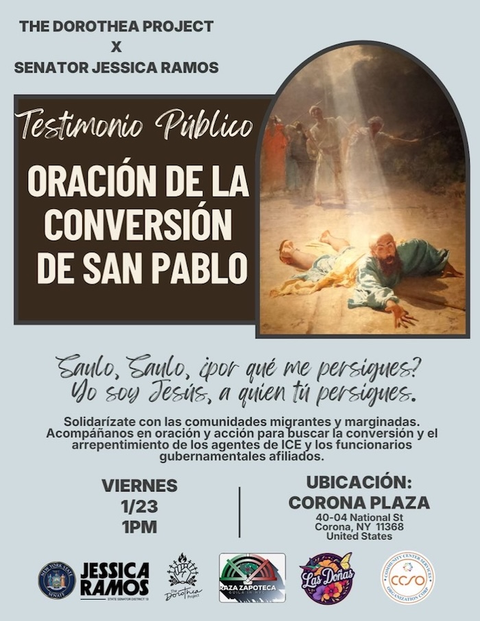 La senadora Jessica Ramos y el Proyecto Dorothea organizan hoy viernes en la tarde un Testimonio Público para que los agentes de ICE se porten bien con nuestra comunidad, se conviertan. Es la Fiesta de la Conversión de San Pablo.