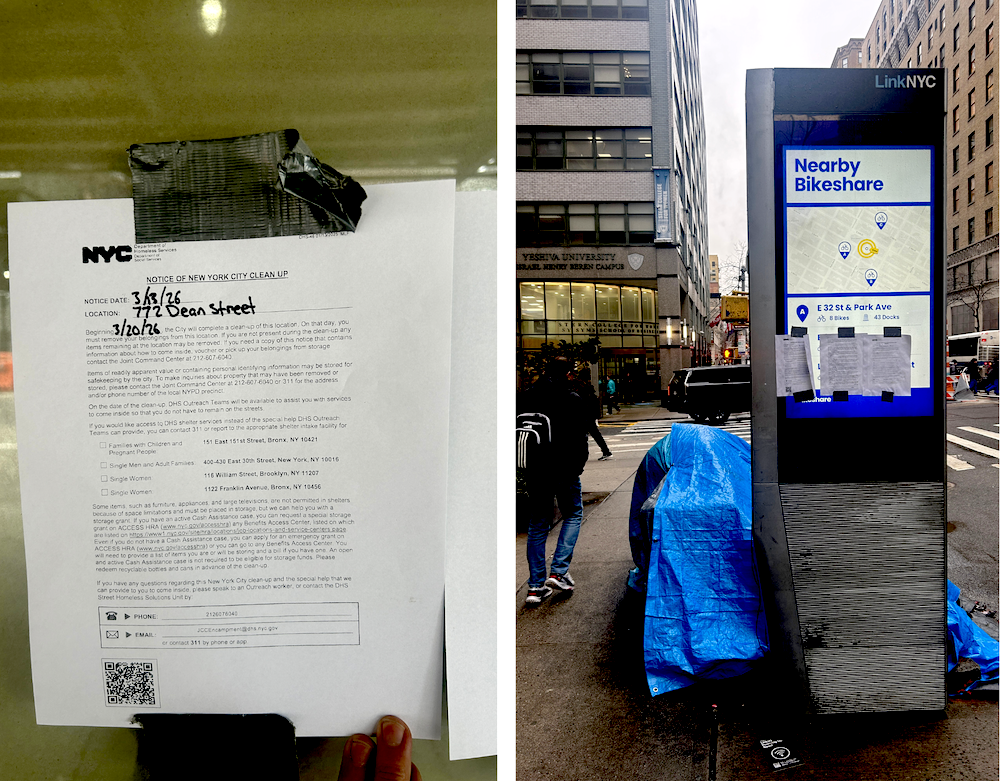 Izquierda: Un aviso municipal sobre una limpieza planificada de campamento en Dean Street, en Brooklyn. Derecha: Más avisos de limpieza en Lexington Avenue y la calle 33 en Manhattan. (Patrick Spauster/City Limits)