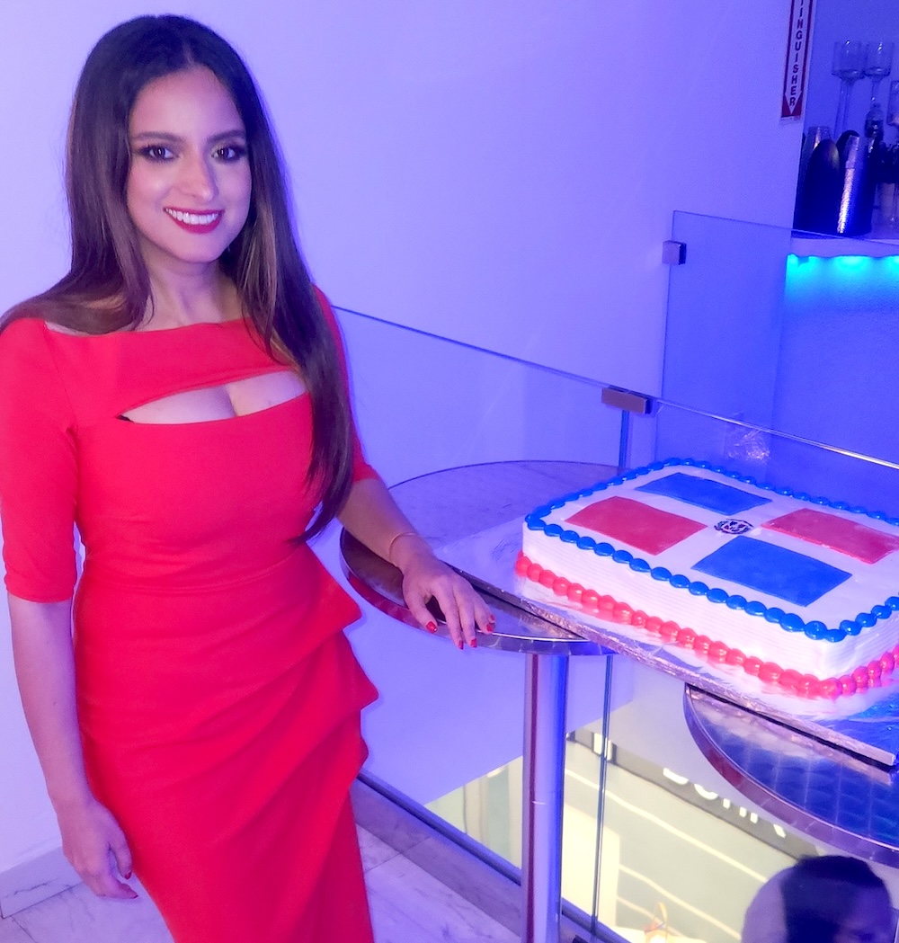 La asambleísta Jenifer Rajkumar al lado de la torta con la bandera dominicana.
