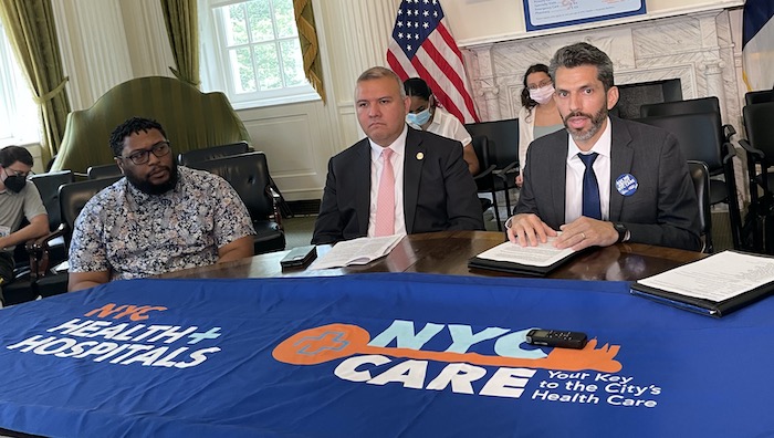 El doctor Jonathan Jiménez, director ejecutivo de NYC Care, y el comisionado de la Oficina del Alcalde para Asuntos de Inmigrantes, Manuel Castro, hicieron el anuncio en la alcaldía frente a la prensa étnica.