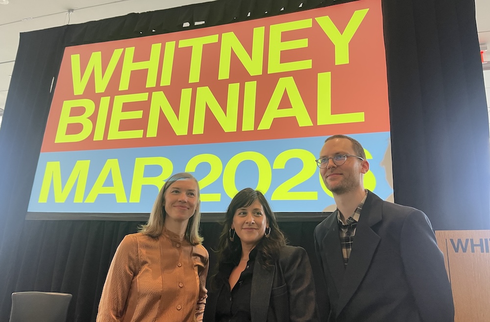 En el primer piso de la Bienal Whitney 2026, desde la izquierda, Kim Conaty, jefa de curadoría, Marcela Guerrero y Drew Sawyer, curadores. Fotos Javier Castaño