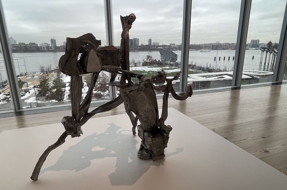 Esculturas con objetos naturales son de Sarah M. Rodríguez y al fonde se aprecia el Río Hudson.