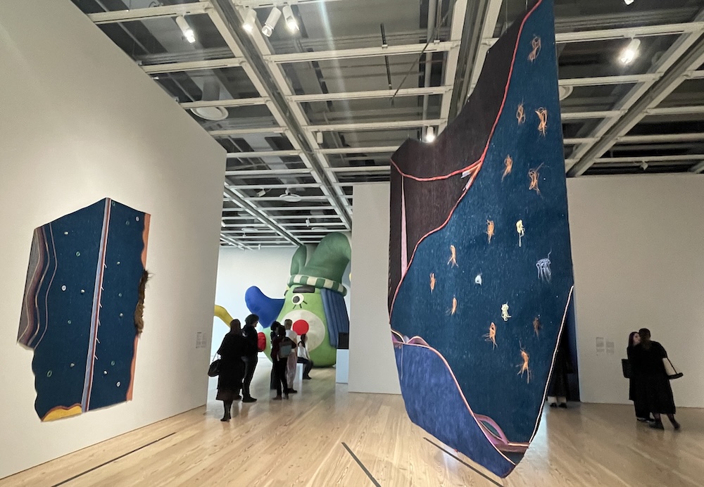 Instalación de Teresa Baker utilizando telas y pasto artificial, y al fondo, los inflables gigantes de Pat Oleszko.