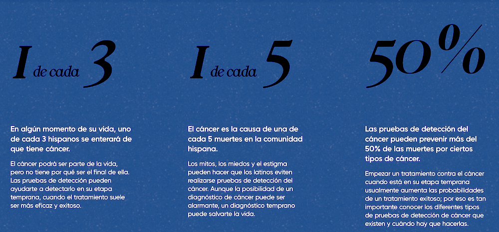 Durante sus vidas, 1 en 3 Latinos serán diagnosticados con cáncer en su vida y 1 en 5 morirán por motivos relacionados al cáncer. Con su campaña ‘Chequase A Tiempo’ (Get Checked A Tiempo) y su anuncio de servicio público, MSK está trabajando con la comunidad latino para alentar a esta comunidad en riesgo a hacerse estos exámenes rutinarias para detectar el cáncer antes de que sea muy tarde.