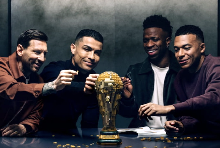 Las estrellas de la Copa Mundial 2026 promocionando un anuncio de Lego, desde la izquierda, Messi, Ronaldo, Vinicius Jr y Mbappé. Foto cortesía