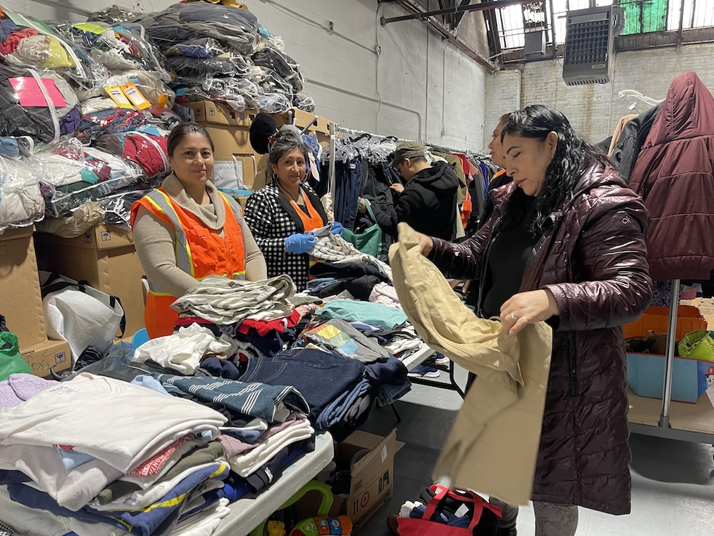 Beatriz Sánchez y María Carchi entregando ropa a los inmigrantes.