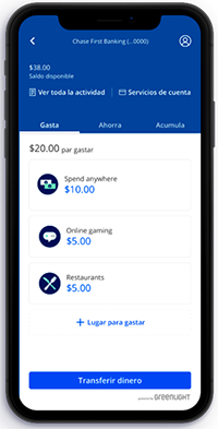 Chase First Banking está diseñada para que los padres tengan el control, mientras los niños tienen la libertad de aprender a ganar, gastar y ahorrar; impulsada por Greenlight®, una compañía de tecnología financiera para familias