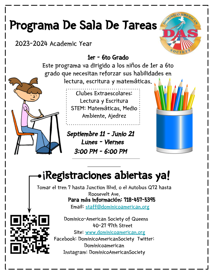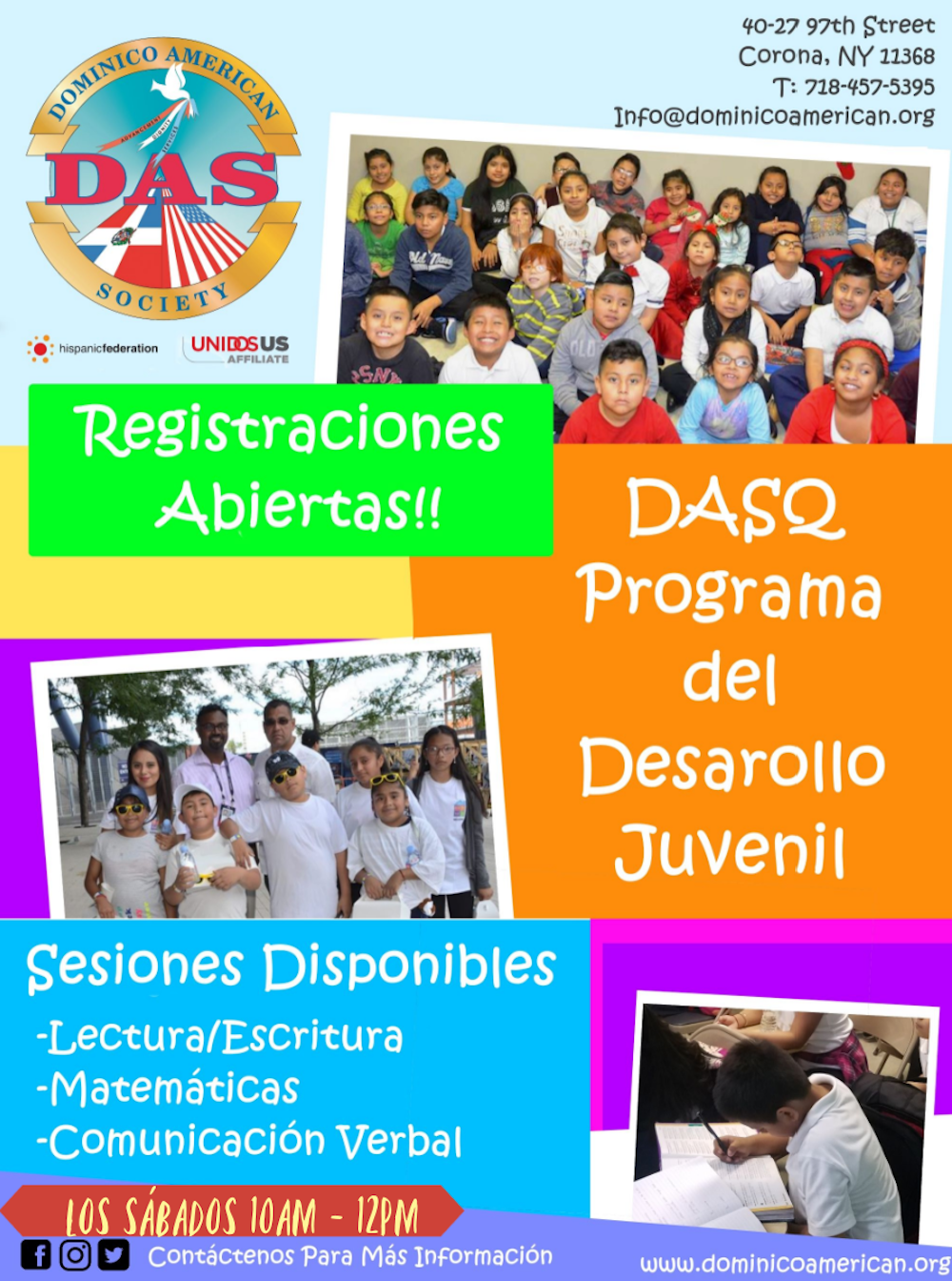 La organización comunitaria Sociedad Dominico Americana (DAS), con sede en Corona, Queens, ofrece una serie de servicios como clases para después de la escuelas, aprendizaje del inglés y de computadoras, además de programas recreativos para niños y niñas.