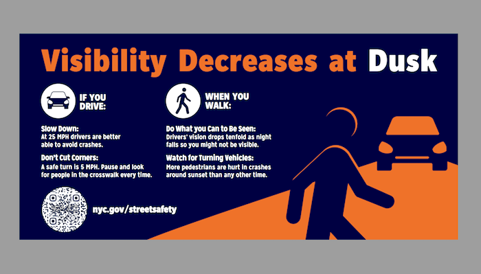 Consejos sobre el Atardecer y la Oscuridad se distribuyen hoy a conductores y peatones. Crédito: NYC DOT
