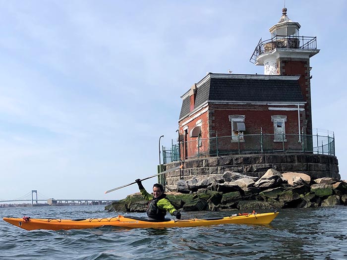 El director de QueensLatino, Javier Castaño, en las aguas de Orchard Beach en el Bronx este mes de abril. Foto Larry Lembo