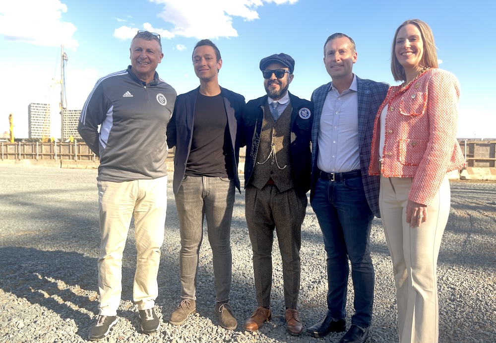 En el terreno donde habrá un estadio de fútbol en Willets Point, Queens, desde la izquierda, Jon Stemp, Rashed Singaby, Francisco Moya, Brad Sims y Jennifer O’Sullivan. Foto Javier Castaño