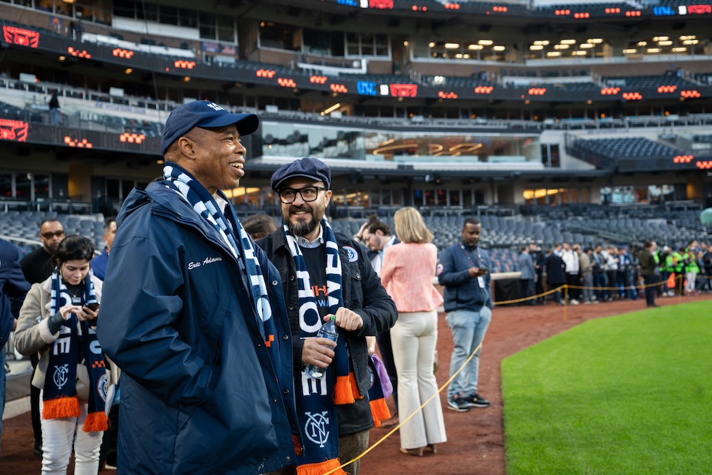 En el estadio Citi Field, el alcalde Eric Adams y el concejal Francisco Moya antres del partido de fútbol entre NYCFC que venció a D.C. United por 2 a 0. Foto alcaldía de NY.
