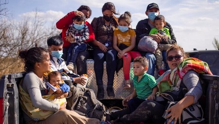 Familias que trataban de cruzar el Río Grande son transportada por la policía a refugios en la frontera. Foto Voa