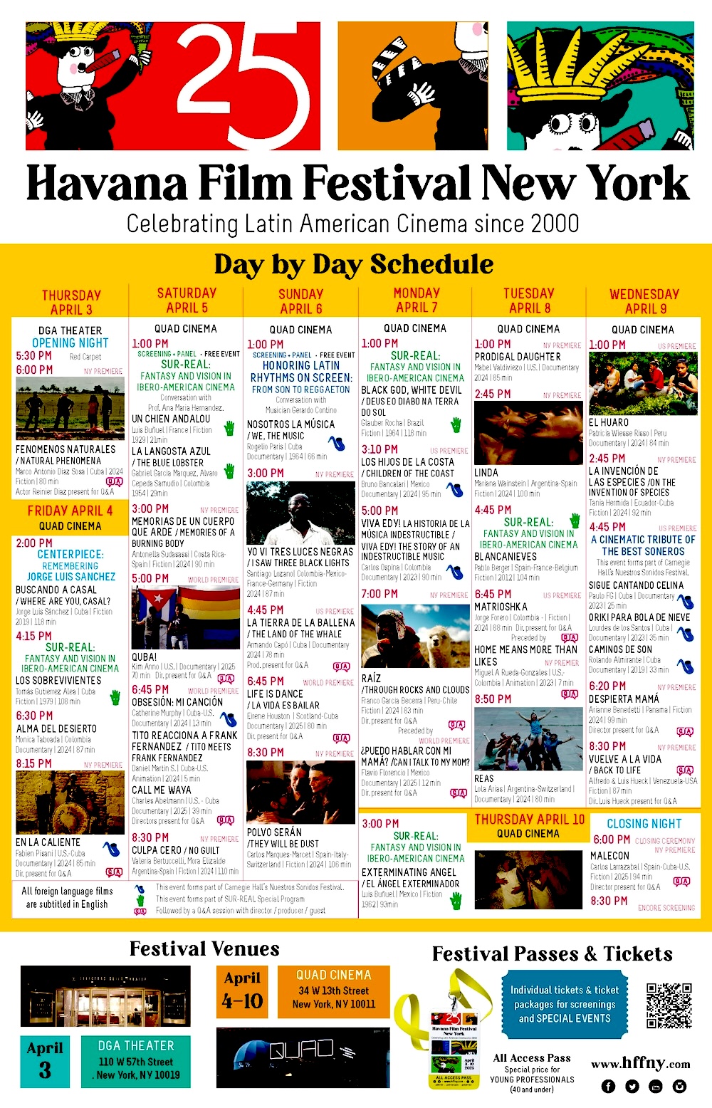 Havana Film Festival NY(www.HFFNY.com), un proyecto de The American Friends of the Ludwig Foundation of Cuba (AFLFC), se convierte en el festival de cine latino más antiguo de Nueva York celebrando 25 años trayendo historias de Latinoamérica, España y los latinos en la diáspora a la Gran Manzana. Con un programa excepcional que celebra la diversidad de voces y expresiones culturales de Iberoamérica, HFFNY 2025 estará del 3 al 10 de abril, presentando más de 35 películas de Argentina, Colombia, Costa Rica, Cuba, Ecuador, México, Perú, Panamá, España, Venezuela y los latinos en EE.UU; muchas de ellas en sus estrenos mundiales, estadounidenses y neoyorquinos. También ofrece charlas y sesiones de preguntas y respuestas con la asistencia de figuras destacadas del cine latinoamericano. Más de 20 cineastas viajarán a Nueva York para participar en el festival. Todas las películas extranjeras estarán subtituladas en inglés.