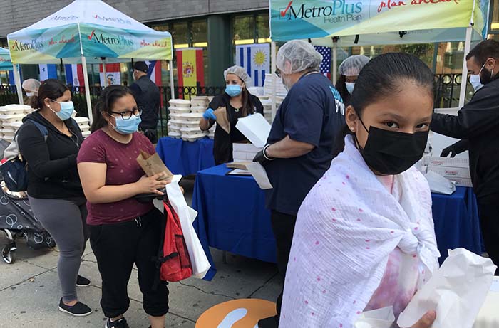 Al fondo, Maricruz Astudillo, acompañada de sus dos hijas, Isabel y Belinda, cuando recogían comida y utensilios de aseo en el Hospital Elmhurst de Queens durante la celebración de la Herencia Hispana. Fotos Javier Castaño