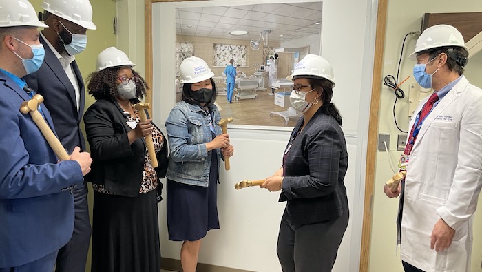 El doctor Frederick Friedman, director de ginecología del NYC Health + Hospital Elmhutst, acompañó a la congresista Meng en su recorrido por la unidad pre-parto/ “Tenemos siete cuartos y con esta inversión vamos a modernizarlos para el beneficio de las madres y sus familias”, dijo el doctor Friedman, quien ayudó a romper una de las paredes como simulacro del proceso de construcción que comenzará pronto.