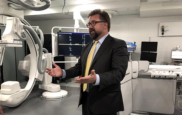 El doctor J. Mocco explicando cómo funciona el nuevo centro del Hospital Mount Sinai de Queens para atender pacientes con infarto y obstrucción cerebral. Fotos Javier Castaño