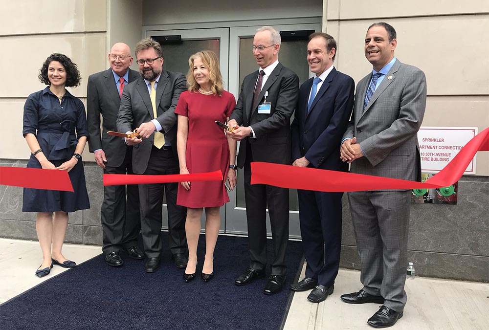 En el corte de cinta, desde la izquierda, Argeta “Roula” Siklas, Michael E. Minikes, J. Mocco, Caryn A. Schwab, David Reich, Howard A. Zucker y Costa Constantinides. Foto Javier Castaño