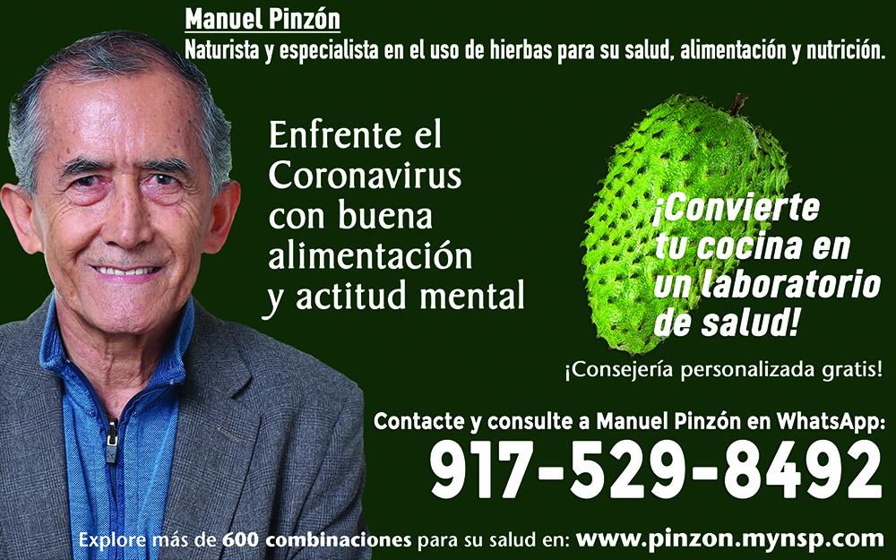 Pinzón es un especialista en el uso de hierbas para la salud, la alimentación y Nutrición. Para una consulta con Pinzón, puede llamarlo por WhatsApp al 917-529-8492. También puede visitar la página digital www.pinson.mynsp.com para que explore más de 600 combinaciones de productos naturales para que mejore su salud.