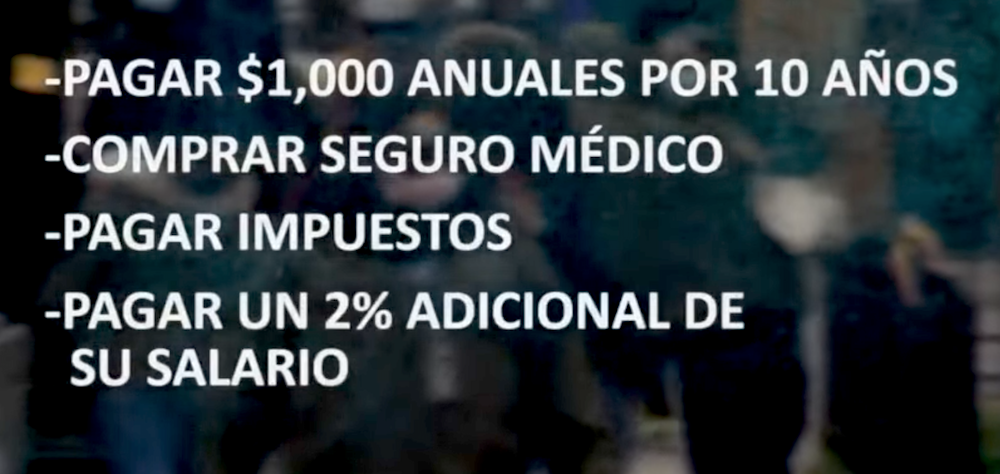 El plan, llamado ‘‘Dignity for Immigrants while Guarding our Nation to Ignite and Deliver the American Dream Act’’, o ‘‘DIGNIDAD’’ contemplaría que los indocumentados que puedan demostrar que tienen al menos cinco años de vivir y trabajar en EE. UU. y que han pagado impuestos calificarían para entrar en el programa, que ofrecería la oportunidad de pagar una multa durante 10 años, de 1.000 dólares por cada año para mantener el permiso de trabajo y de residencia legal en el país.