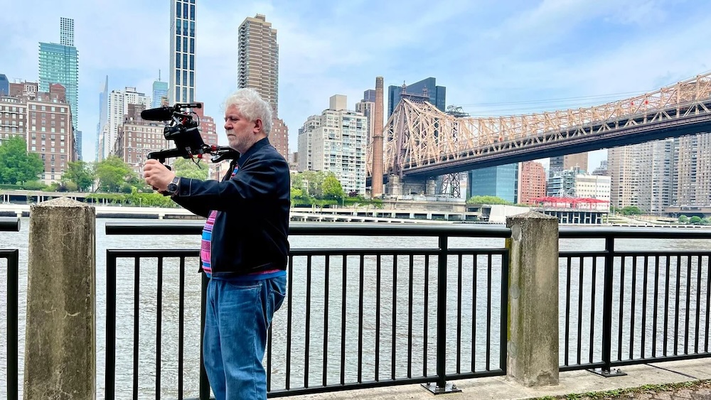 Pedro Almodóvar bajo el marco del Queensboro Bridge en Queens, NYC. Foto cortesía Agustín Almodóvar.