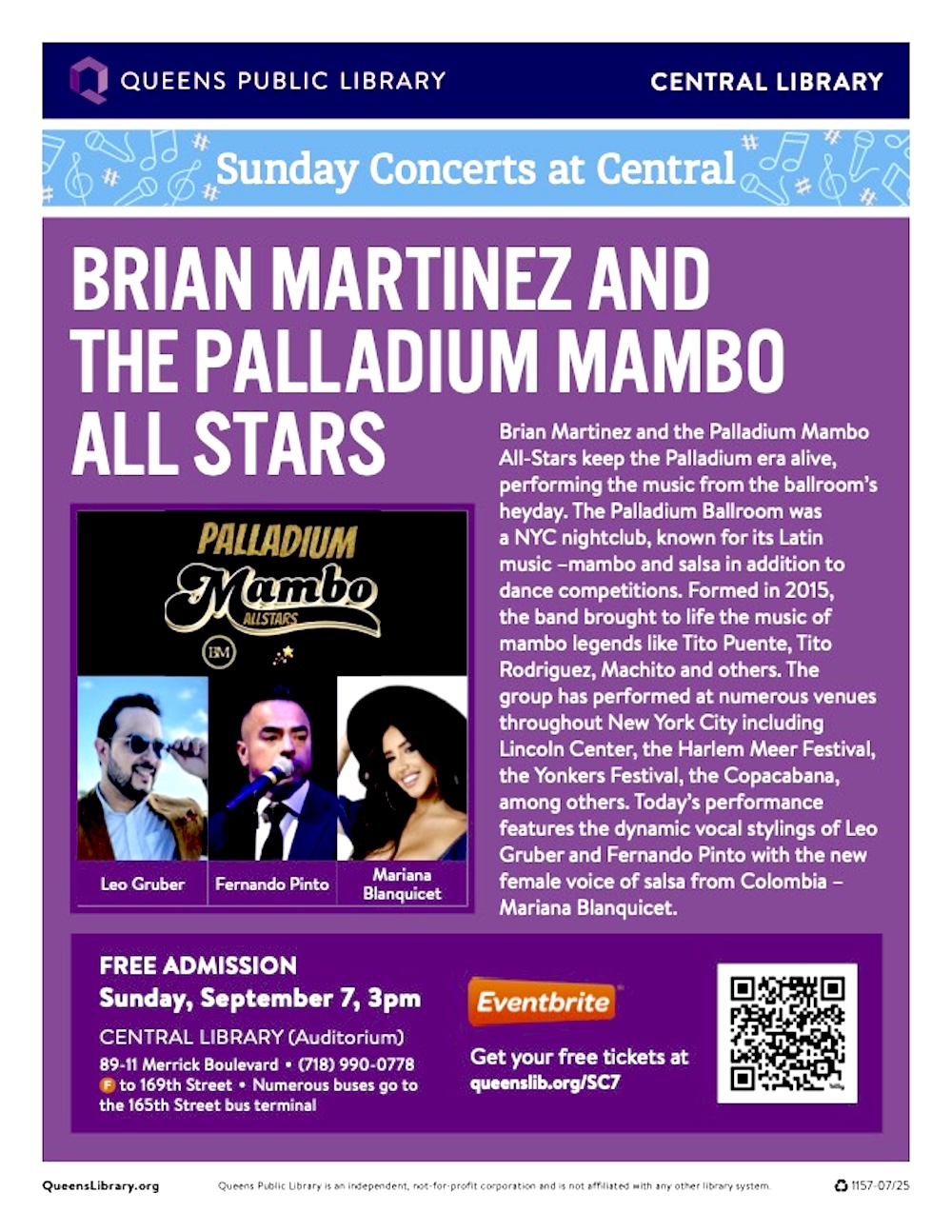 Los conciertos del domingo en la Biblioteca Central presentan a Brian Martínez y The Palladium Mambo All Stars. Brian Martinez y los Palladium Mambo All-Stars mantienen viva la era del Palladium, interpretando la música de la época dorada del salón de baile. El Palladium Ballroom era un club nocturno neoyorquino conocido por su música latina, como el mambo y la salsa, además de sus competencias de baile.
