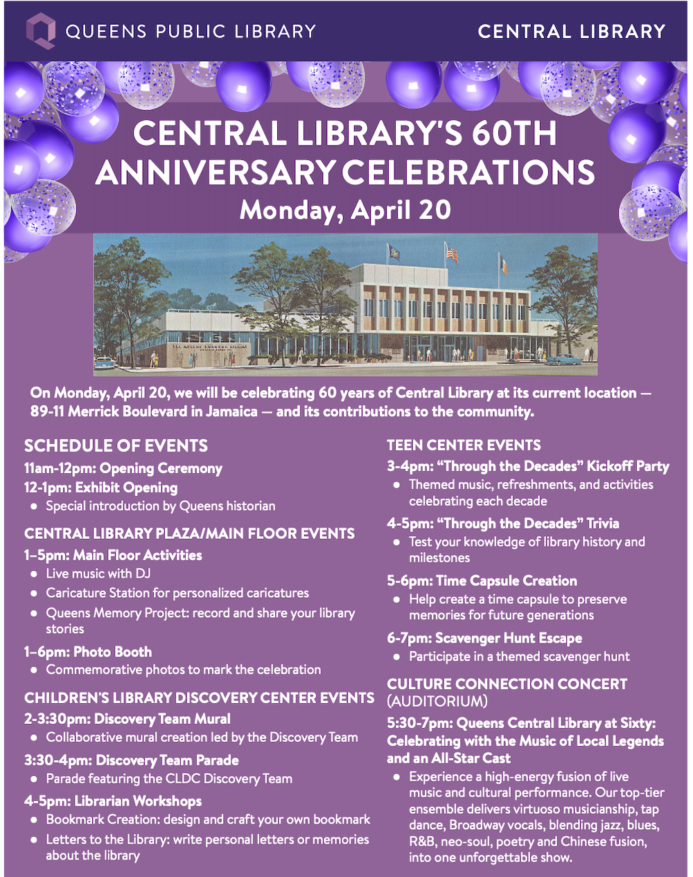 Conmemorará el 60º aniversario de su Biblioteca Central en el 89-11 de Merrick Blvd. el lunes 20 de abril, con actividades para toda la familia, talleres interactivos y un concierto nocturno en honor a legendarios músicos de Queens. La ceremonia de inauguración comenzará a las 11 a.m., seguida de una presentación a las 12 p.m. a cargo del historiador del condado de Queens, Jason Antos, durante la inauguración de una exposición que destaca el legado de la Biblioteca Central. A lo largo del día, los asistentes podrán disfrutar de un DJ en directo, un puesto de caricaturas y una cabina de fotos.