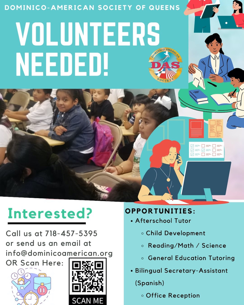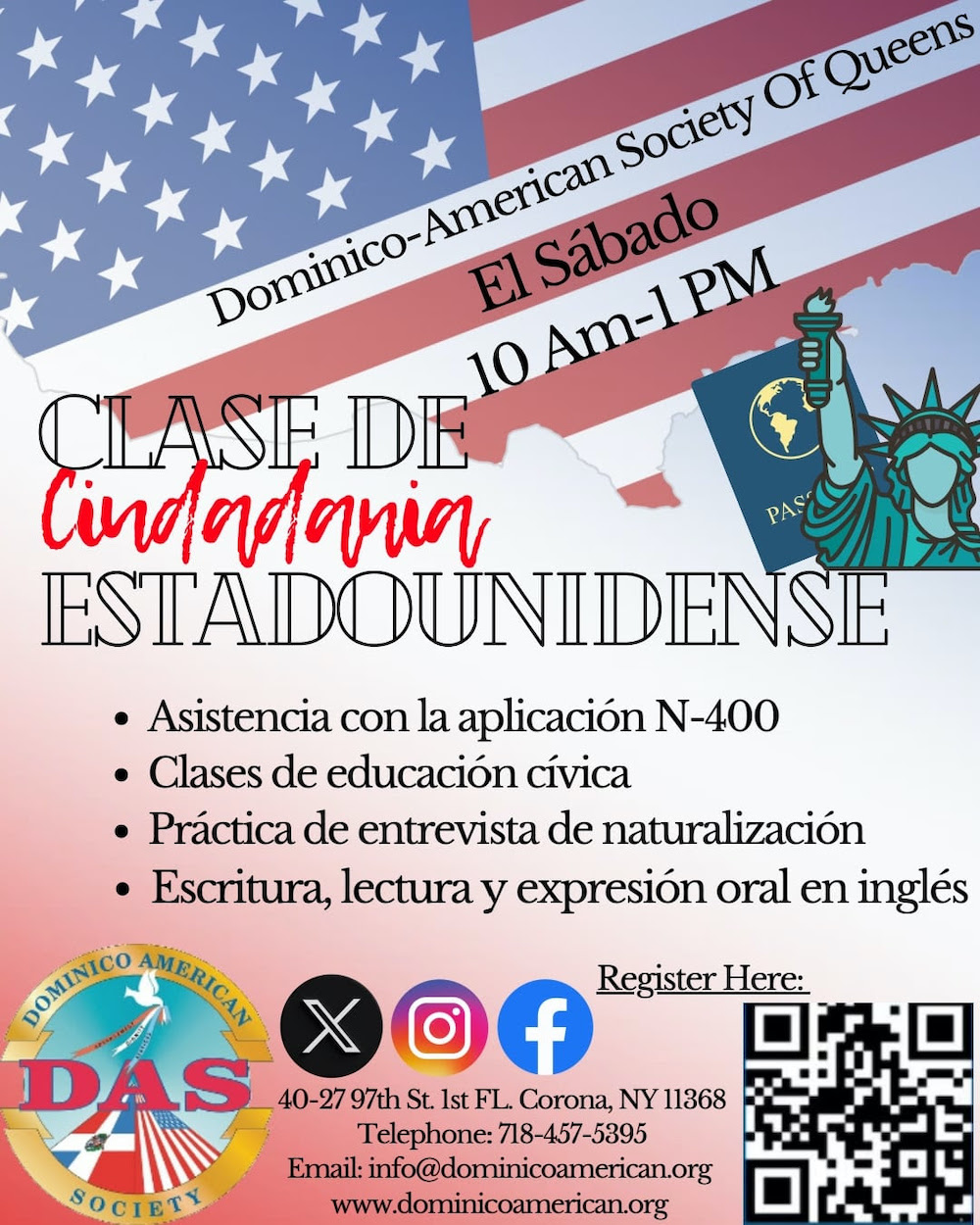 La Sociedad Dominico Americana (DAS), con sede en Queens, sigue este año 2024 con una serie deactividades educativas y sociales por el desarrollo de la comunidad latina de Nueva York y de esta nación. DAS celebra la herencia dominicana en este continente, dicta clases de inglés y ciudadanía y está buscando voluntarios para ampliar y diversificar aún más sus programas comunitarios y eventos culturales.