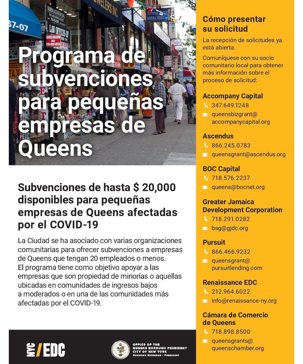 El presidente del condado de Queens, Donovan Richards, en asociación con la Ciudad y Pursuit, anunció el lanzamiento del Programa de Subsidios para las pequeñas empresas de Queens para proporcionar recursos a negocios afectados por COVID19. A través de una generosa donación de $ 17.5 millones de Steve Cohen, la Ciudad se asoció con organizaciones comunitarias para ofrecer subsidios por valor de $ 15 millones a pequeños negocios de Queens que necesiten hasta $ 20,000 para solventar sus gastos operativos.