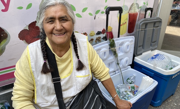 Una mujer que con solo hacer contacto visual, regala a los transeúntes una sonrisa. En ese lugar es muy conocida y los transeúntes la saludad con insistencia.