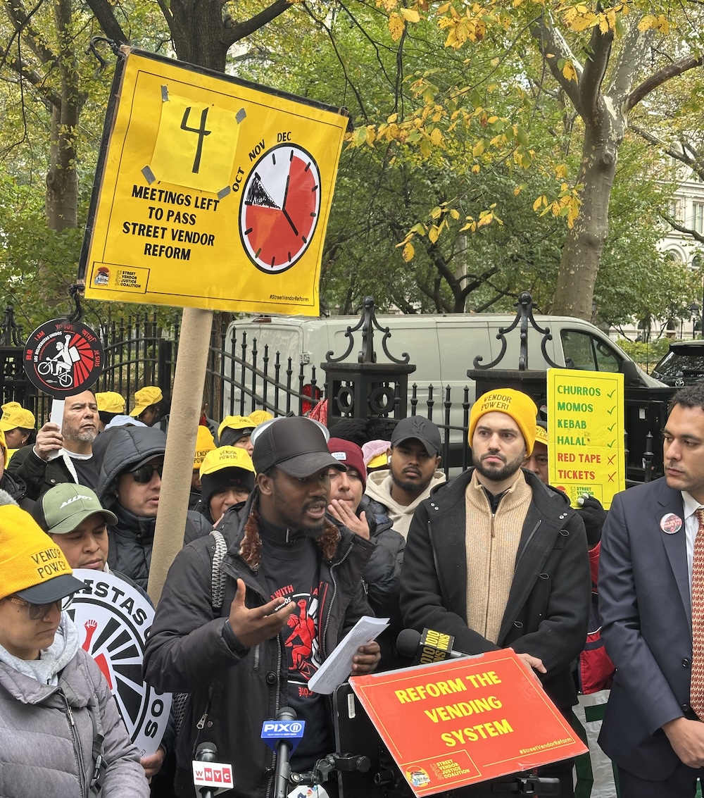 El concejal Shaun Abreu hablando en defensa de los vendedores ambulantes y los deliverista frente al edificio de la alcaldía de Nueva York. Fotos cortesía